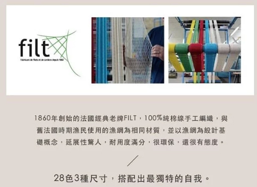 法國的百年老牌,法國人的生活必備品,如今更是席捲日韓市場時尚的it bag—法國Filt 手工編織袋。以舊法國時代漁民使用的漁網為設計概念,100%純棉的棉線手工製作,有極大的延展性,收起時又不佔空間,隨身攜帶也毫無負擔;在環保訴求的前提上,創造出最大的實用價值。