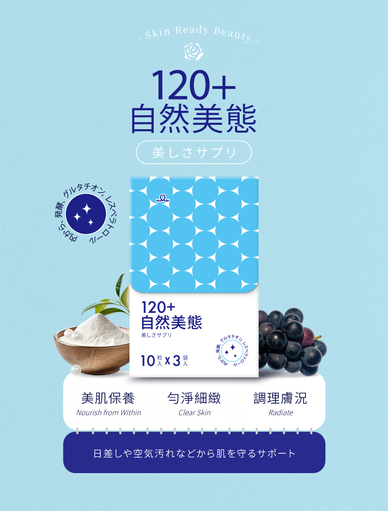 茶萃取物、葡萄籽萃取物、穀胱甘肽、白藜蘆醇、日本珍珠粉、蝦紅素、玫瑰花萃取物