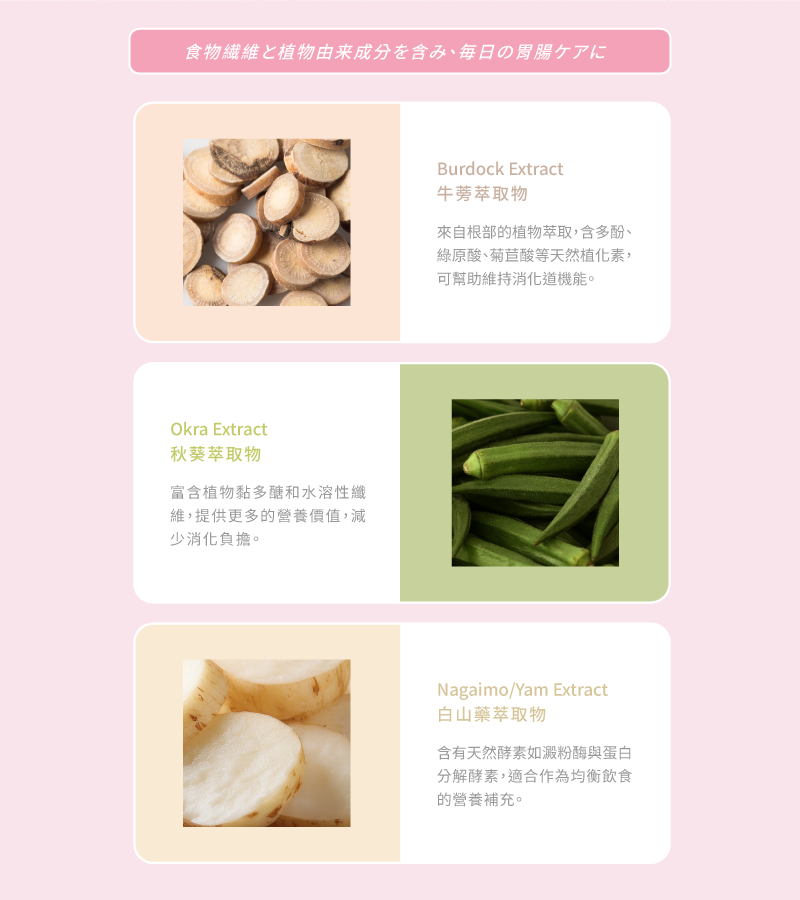 高麗菜濃縮粉末、秋葵萃取物、黑生薑萃取物、珍珠粉、牛蒡萃取物、白山藥萃取物、麥芽糊精