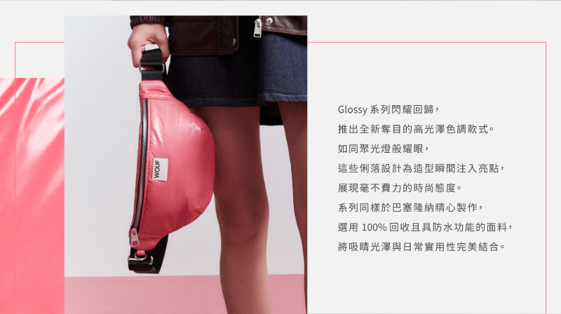 WOUF 品牌的 Glossy 系列閃耀回歸,高光澤色調如聚光燈般耀眼,俐落設計為造型增添亮點,輕鬆展現時尚態度。本系列產品使用 100% 回收塑料瓶製成的再生聚酯纖維布料,擁有防潑水、耐用的優點,以及再生皮革製成的品牌 LOGO 皮標。