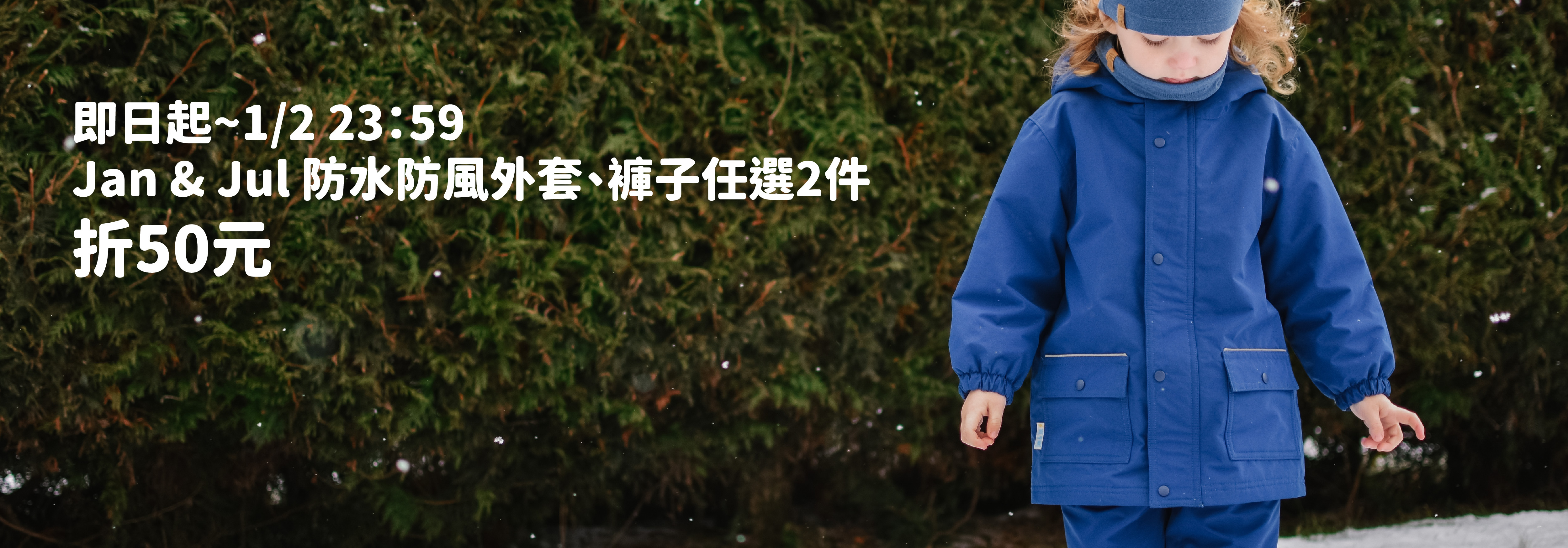 即日起~1/2 23:59 Jan & Jul 防水防風外套、褲子任選2件折50元
