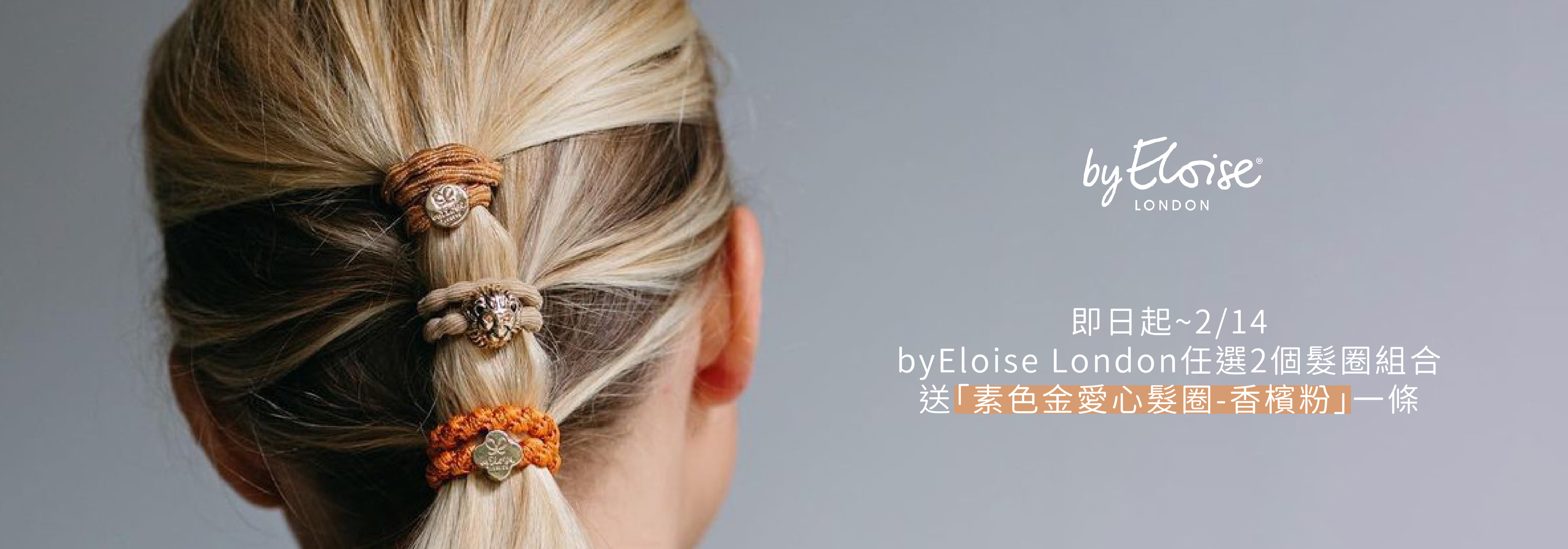 即日起~2/14 23:59,byEloise London任選2個髮圈組合,送「素色金愛心髮圈-香檳粉」一條。