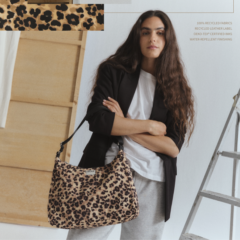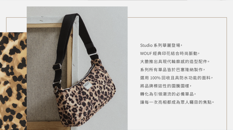 WOUF 經典圖騰轉化為潮流單品,大膽推出具現代輪廓感的造型配件,每次亮相都是全場焦點。本系列產品使用 100%回收塑料瓶製成的再生聚酯纖維布料,擁有防潑水、耐用的優點,使用 Oeko-Tex® 認證墨水印製,以及再生皮革製成的品牌 LOGO皮標。