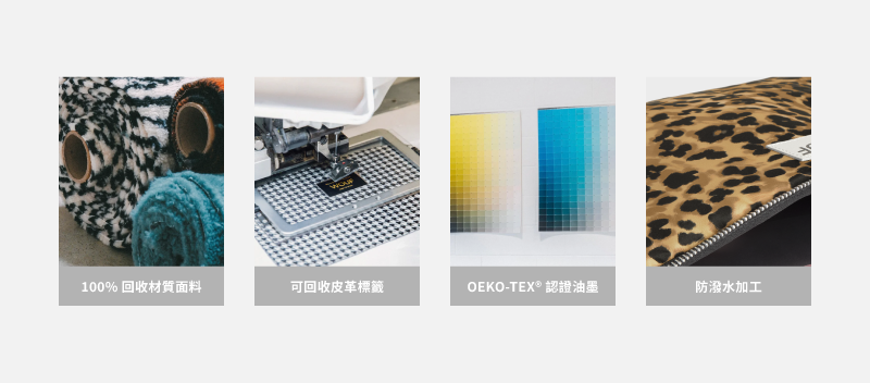 材質:100% 回收再生布料、Bio-based protective 防護泡棉、YKK 拉鍊兩側採用再生聚酯纖維、Oeko-Tex® 認證墨水印製