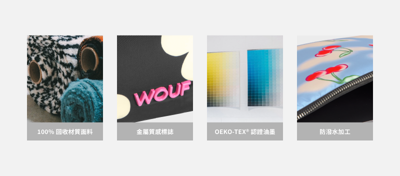 本系列產品使用 100%回收塑料瓶製成的再生聚酯纖維布料,擁有防潑水、耐用的優點,使用 Oeko-Tex® 認證墨水印製,以及金屬質感品牌 LOGO 標誌