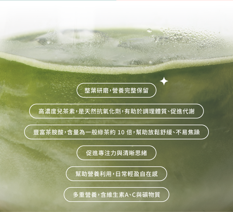 Fibryxa專利異麥芽糊精纖維、富士金砂菊苣纖維、日本Asahi魚鱗膠原蛋白、無糖抹茶粉、紅豆皮萃取物、綜合酵素、綜合蔬果萃取物(檸檬草、花椰菜、白木耳、鳳梨、黑木耳、青木瓜、山楂)、維生素C、決明子萃取物