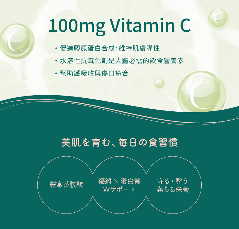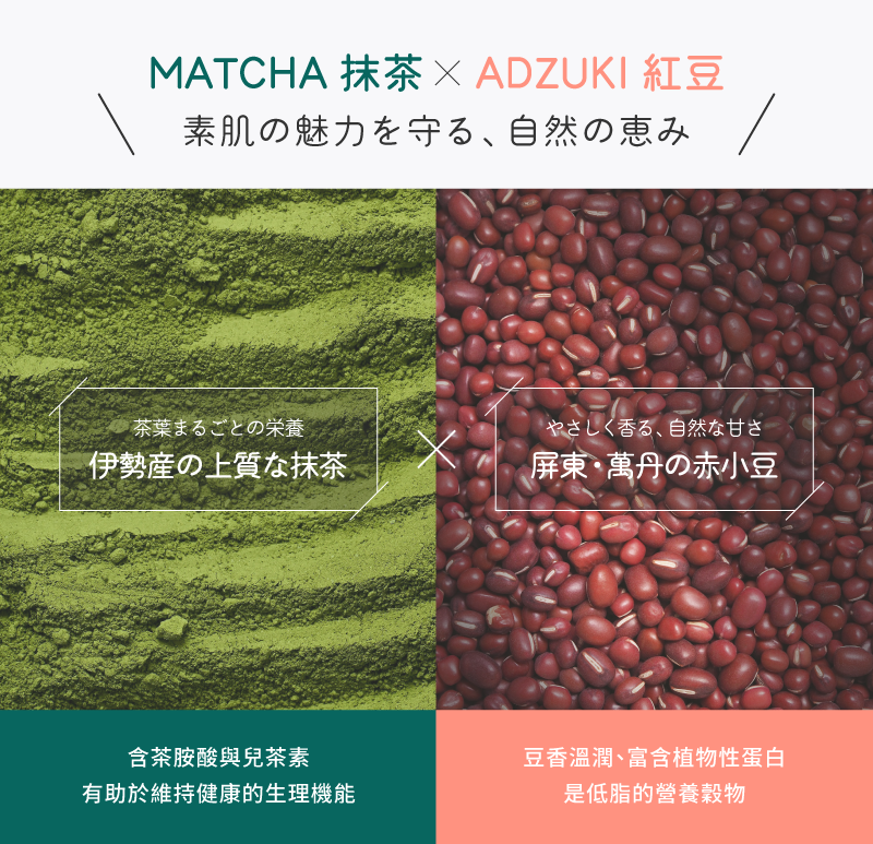 Fibryxa專利異麥芽糊精纖維、富士金砂菊苣纖維、日本Asahi魚鱗膠原蛋白、無糖抹茶粉、紅豆皮萃取物、綜合酵素、綜合蔬果萃取物(檸檬草、花椰菜、白木耳、鳳梨、黑木耳、青木瓜、山楂)、維生素C、決明子萃取物