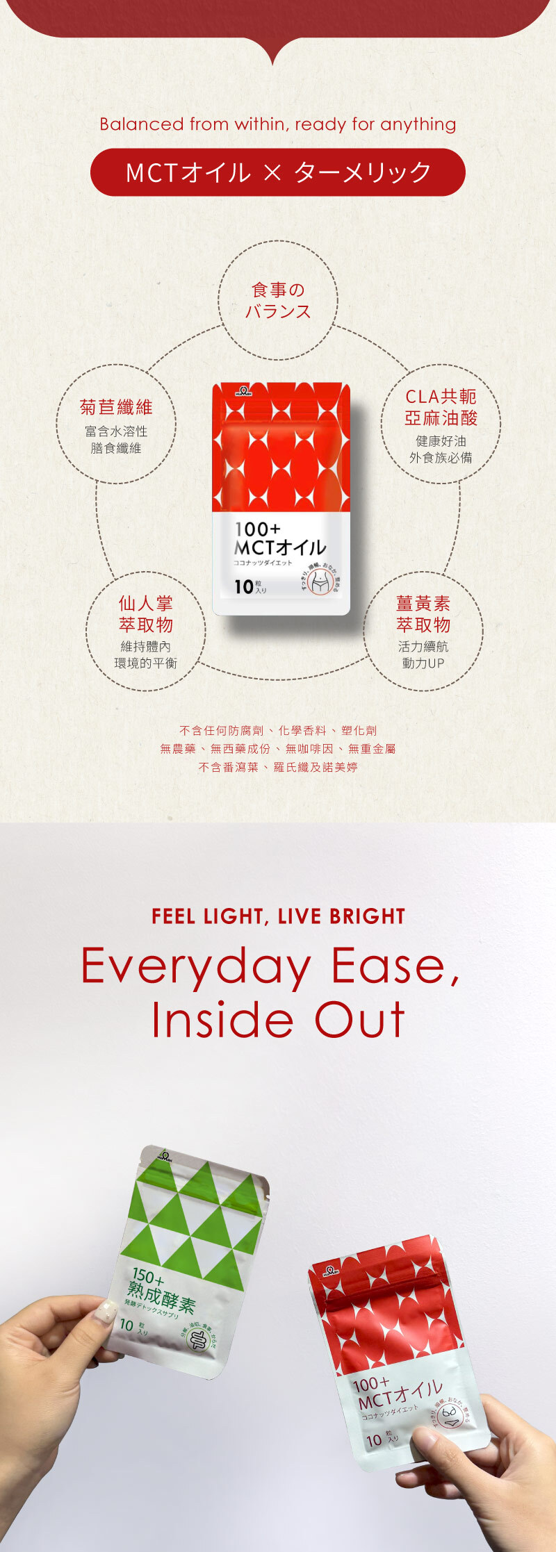 MCT中鏈椰子油萃取物、CLA共軛亞麻油酸、綠茶萃取物、決明子萃取物、仙人掌萃取物、薑黃素萃取物、菊苣纖維