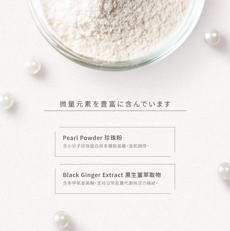 高麗菜濃縮粉末、秋葵萃取物、黑生薑萃取物、珍珠粉、牛蒡萃取物、白山藥萃取物、麥芽糊精