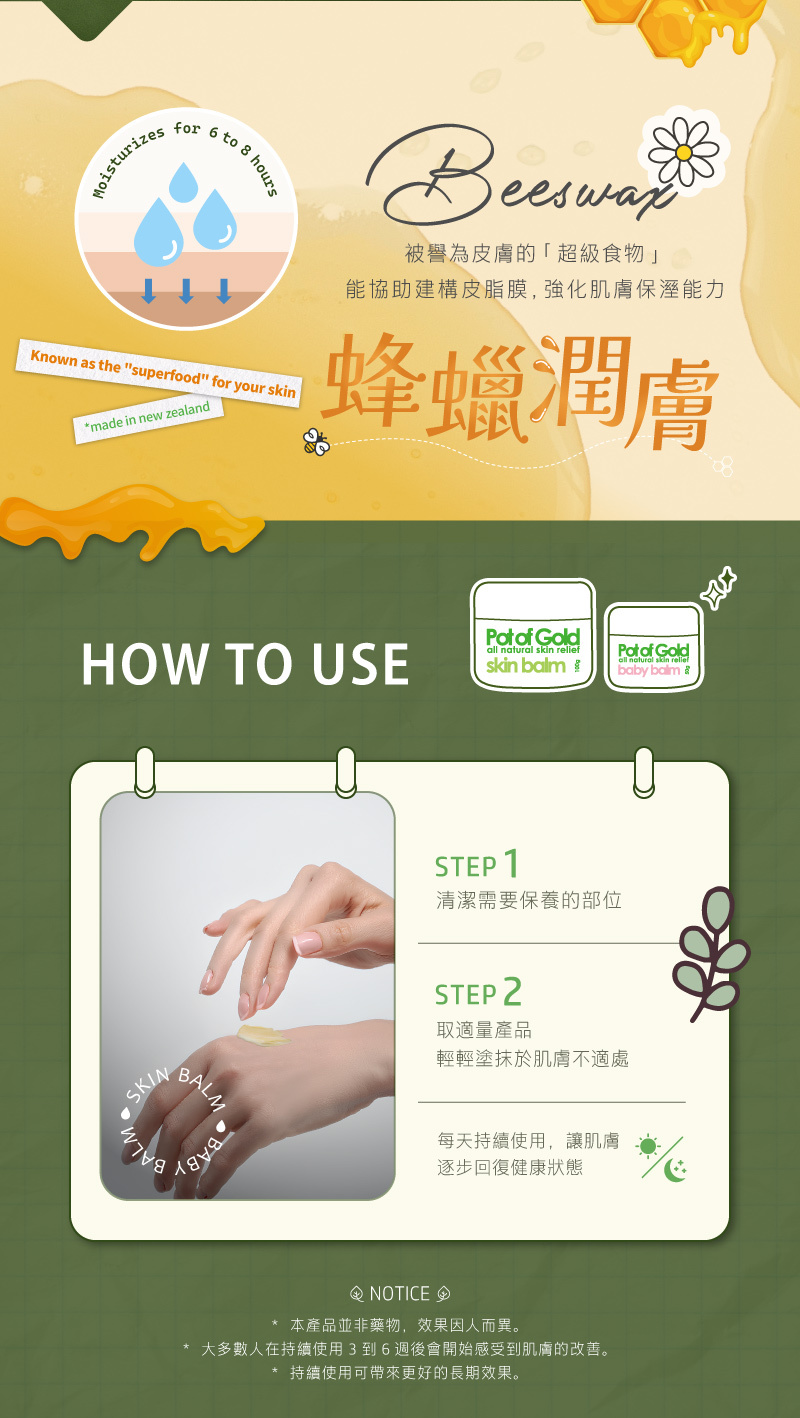 取少量蜂蠟膏塗於肌膚,並輕輕的按摩推開。